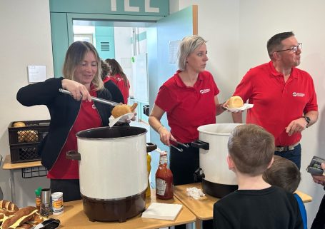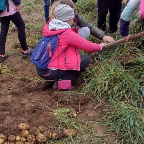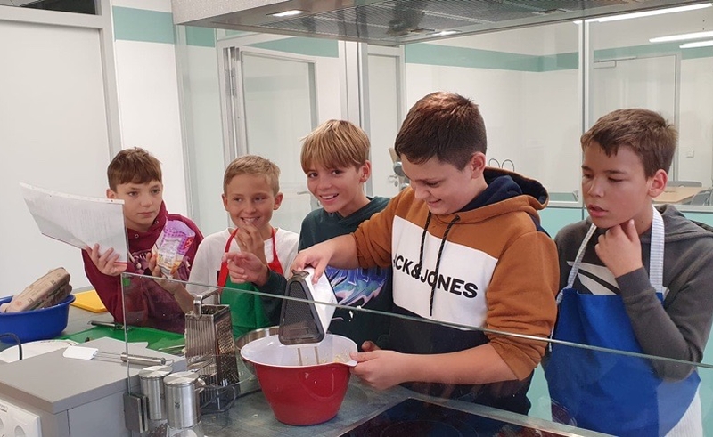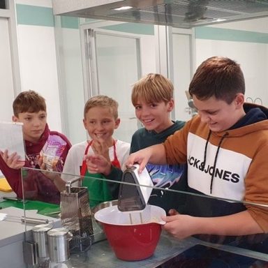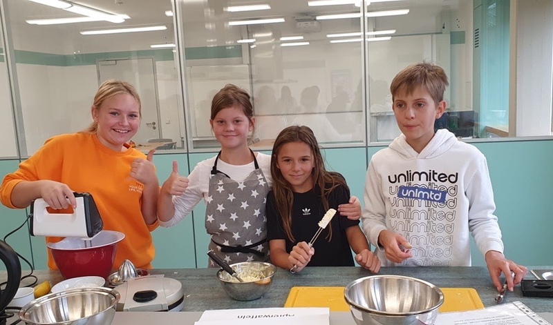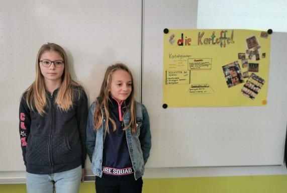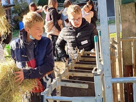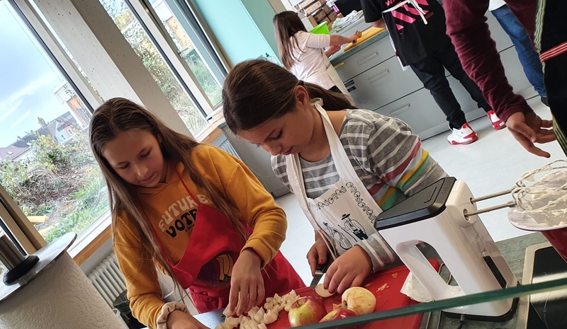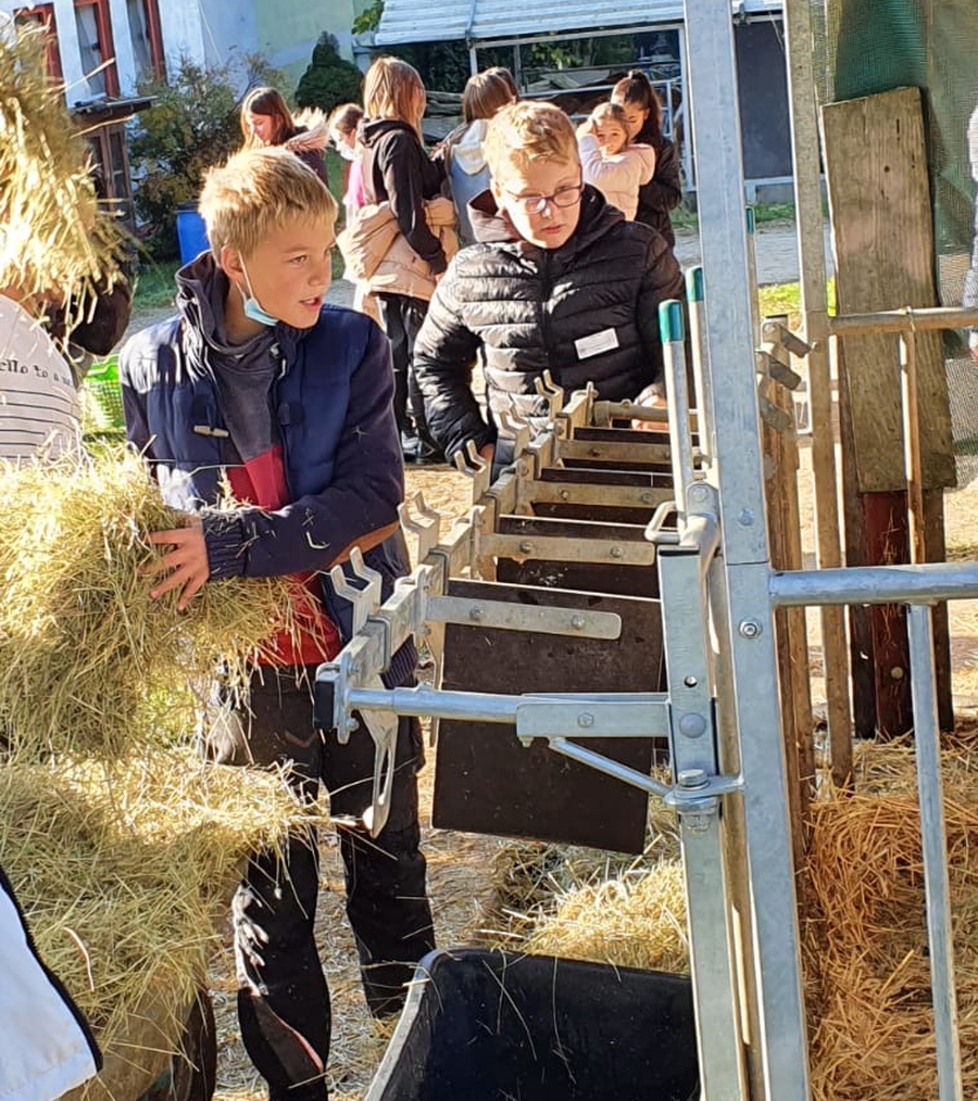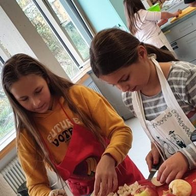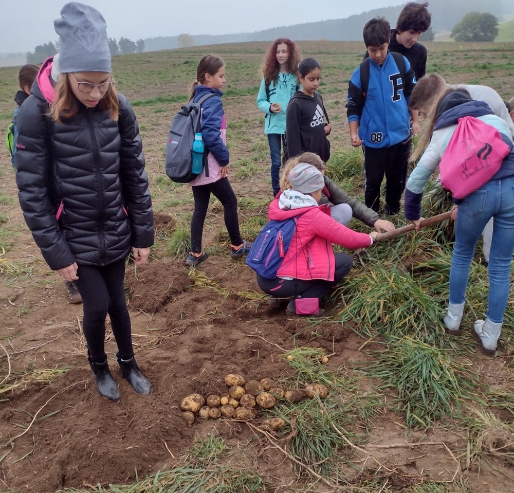 So begann die Woche mit einer Einführung in die gesamte Thematik, einem Training zur Tischkultur und den Grundzügen zur Erstellung eines digitalen Kochbuches. Auch die weiteren Tage waren gefüllt mit vielen Aktionen, die den Kindern grundlegende Kompetenzen für den Alltag näherbrachten. So durften die Schülerinnen und Schüler beim Besuch des Bauernhofs Reichel voller Tatendrang selbst Kartoffeln ernten, Hühner streicheln und Kühe füttern. Dabei spielte die Herkunft unserer regionalen Le-bensmittel immer eine wichtige Rolle.
