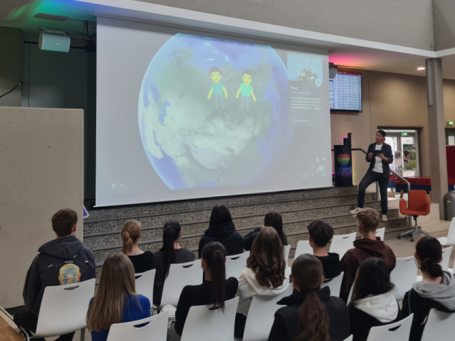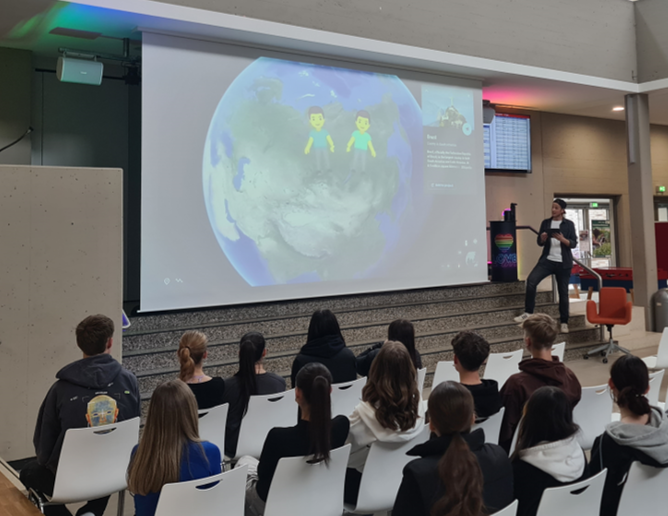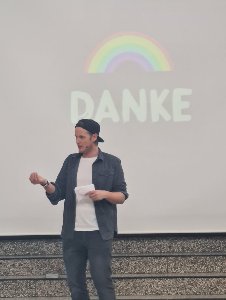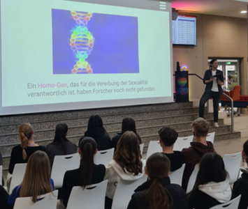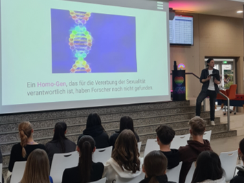 Als sympathischer Aushilfslehrer „Malte Anders“ ermöglichte der Theaterpädagoge und Kabarettist Timo Schweitzer einen Einblick in das Thema Homosexualität sowie die damit möglicherweise verbundene Diskriminierung. Mit viel Humor und persönlichen Geschichten vermittelte er den Jugendlichen in seiner insgesamt 90-minütigen Comedy-Show Hintergrundwissen zum Themenbereich sexuelle Vielfalt. Dabei ging er Vorurteilen auf den Grund und zeigte auf, wie wichtig Toleranz und gegenseitiger Respekt sind. Damit konnte er die Schüler*innen auch zum Nachdenken anregen. Anschließend stellte sich „Malte Anders“ mit bestechender Offenheit den vielfältigen Fragen seines Publikums. Er beendete sein Programm mit einer Weisheit der Coquille-Indianer: „In unserem Stamm wollen wir erreichen, dass jeder sich in die Situation des anderen einfühlt und so lernt, unsereVerschiedenheit zu respektieren.“
