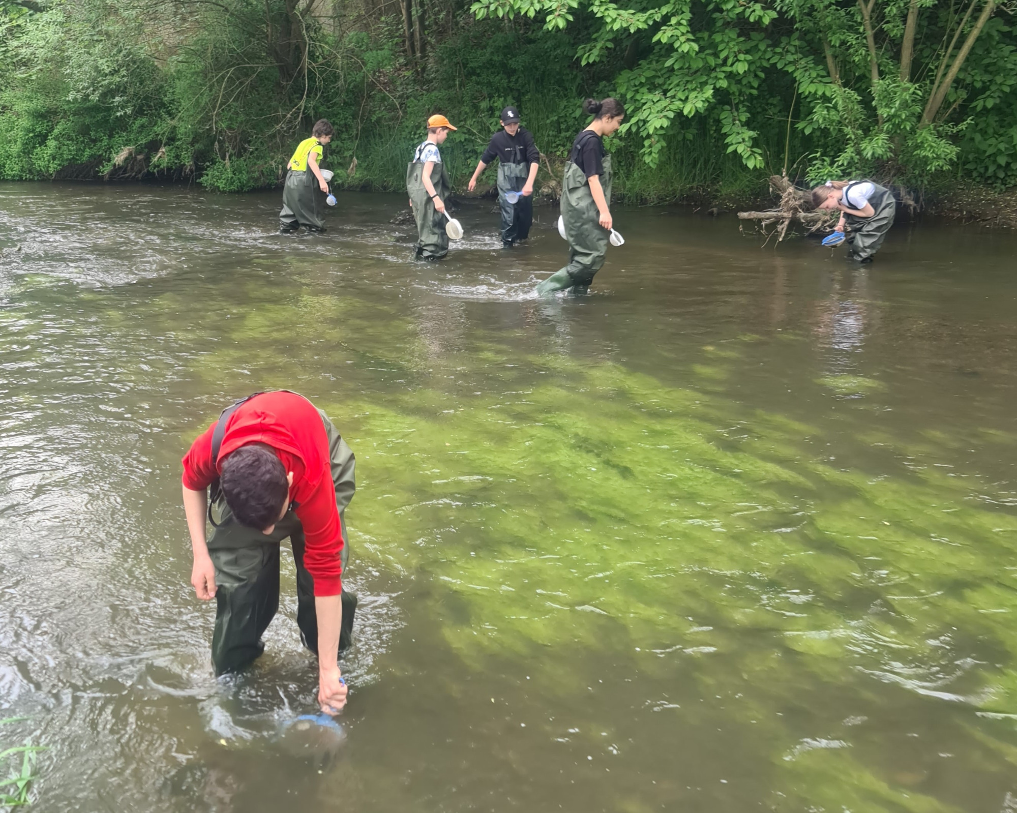 Ausgestattet mit wasserdichten Wathosen, Keschern,Sieben und Pinseln gingen etliche mutige Schüler/innen in der Wondreberfolgreich auf die Jagd nach Wasserlebewesen. Anschließend wurden die kleinenund auch etwas größeren Beutetiere vorsichtig in Petrischalen umgesetzt undunter den Binokularen vergrößert betrachtet. Anhand von Bildmaterial konntendie Lebewesen bestimmt werden. Die Schüler/innen benannten Larven vonKleinlibellen und Eintagsfliegen. Auch eine Wasserschnecke sowie mehrere Krebsewurden aus dem Fließgewässer gefischt. Nach der Betrachtung wurden alle Wasserorganismenwieder in den natürlichen Lebensraum zurückgebracht.