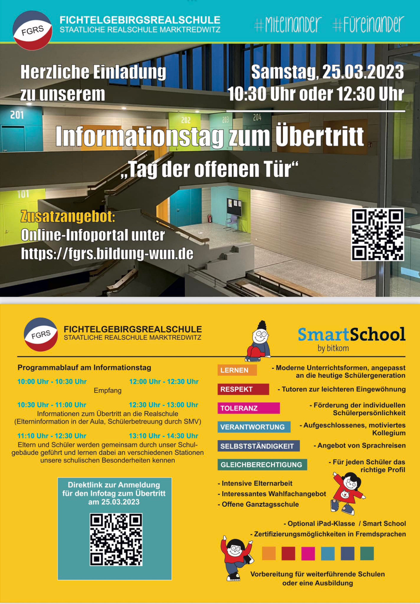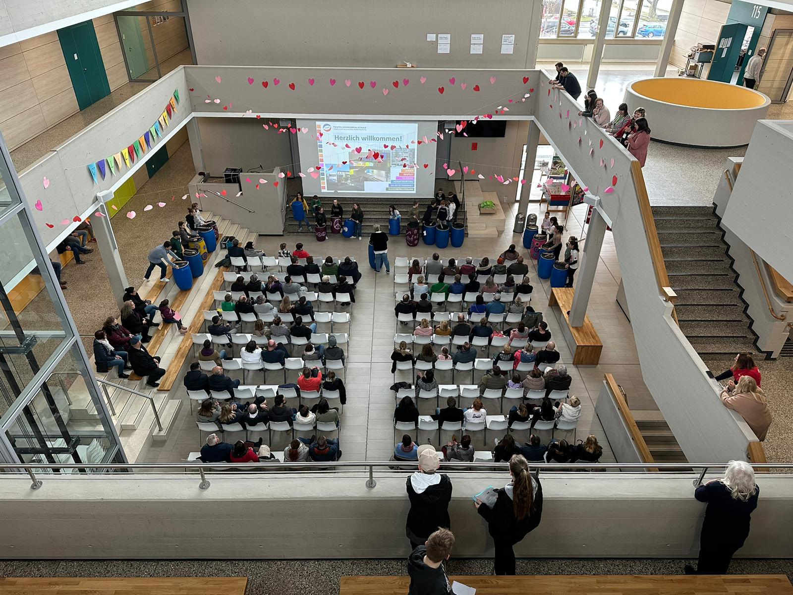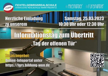 Am Samstag, den 25. März 2023 öffnete die Fichtelgebirgsrealschule ihr schön saniertes und modern ausgestattetes Schulhaus für interessierte Schülerinnen und Schüler sowie deren Eltern und Erziehungsberichtigte, für die im kommenden Schuljahr der Übertritt ansteht. Bereits bei einer erwünschten Anmeldung zeichnete sich ab, dass die Veranstaltung sehr gut besucht sein würde. Nach einem eindrucksvollen Trommelwirbel der Klasse 5A-iPad wurden die Eltern von den Beratungslehrkräften der Schule zu den Formalitäten für den Übertritt informiert, während die Schülerinnen und Schüler eine Schnupperstunde Musik erleben durften. Sie erlernten dabei kleine Percussion Sequenzen, die sie im Anschluss an die Elterninformation auch gleich präsentieren durften. Anschließend wurden die Schülerinnen und Schüler zusammen mit ihren Eltern in Gruppen durch das Schulhaus geführt. Sie lernten dabei den Digitalunterricht für die fünfte Jahrgangsstufe kennen, in dem die fünften Klassen geschult werden, wie man mit